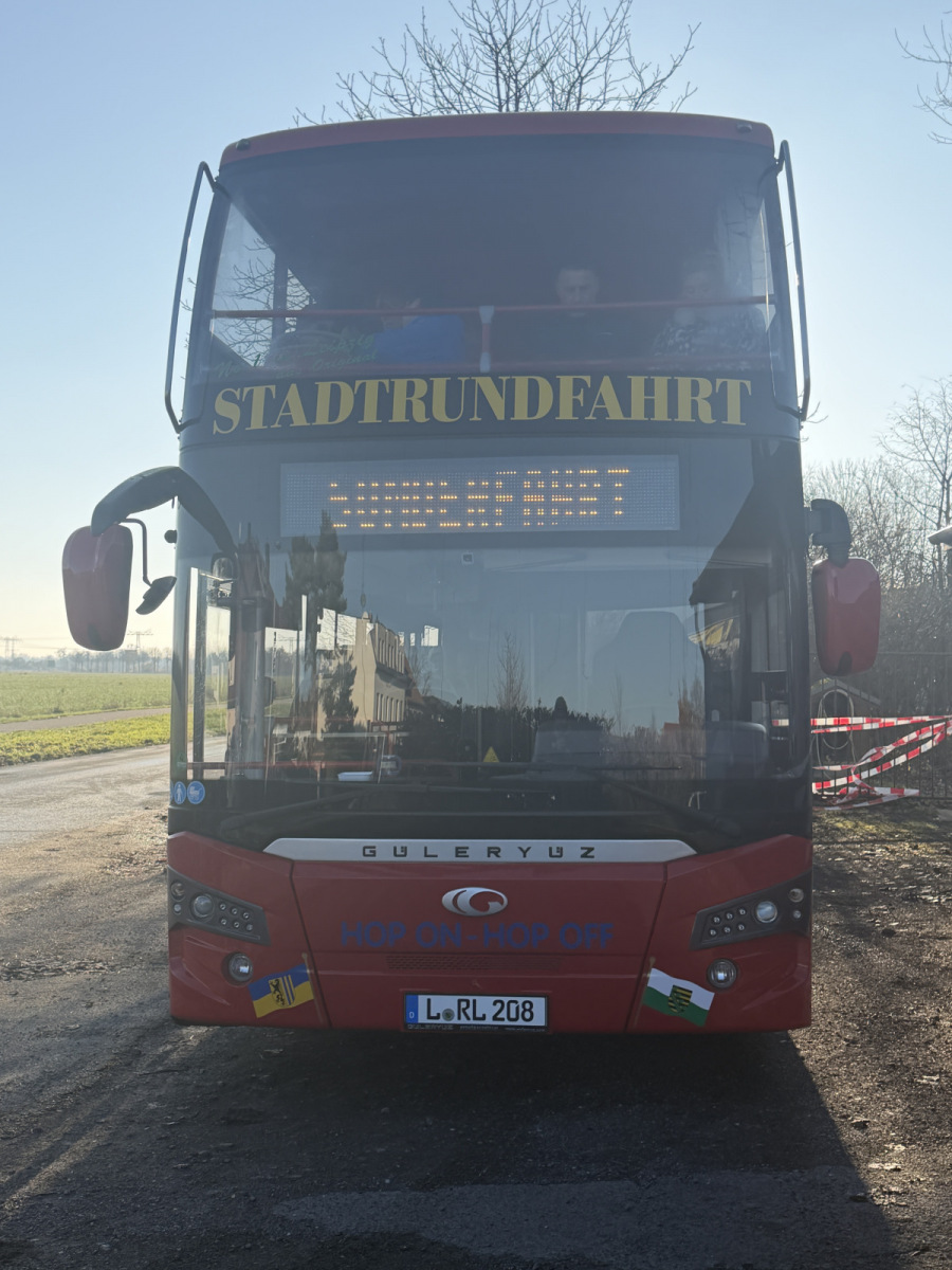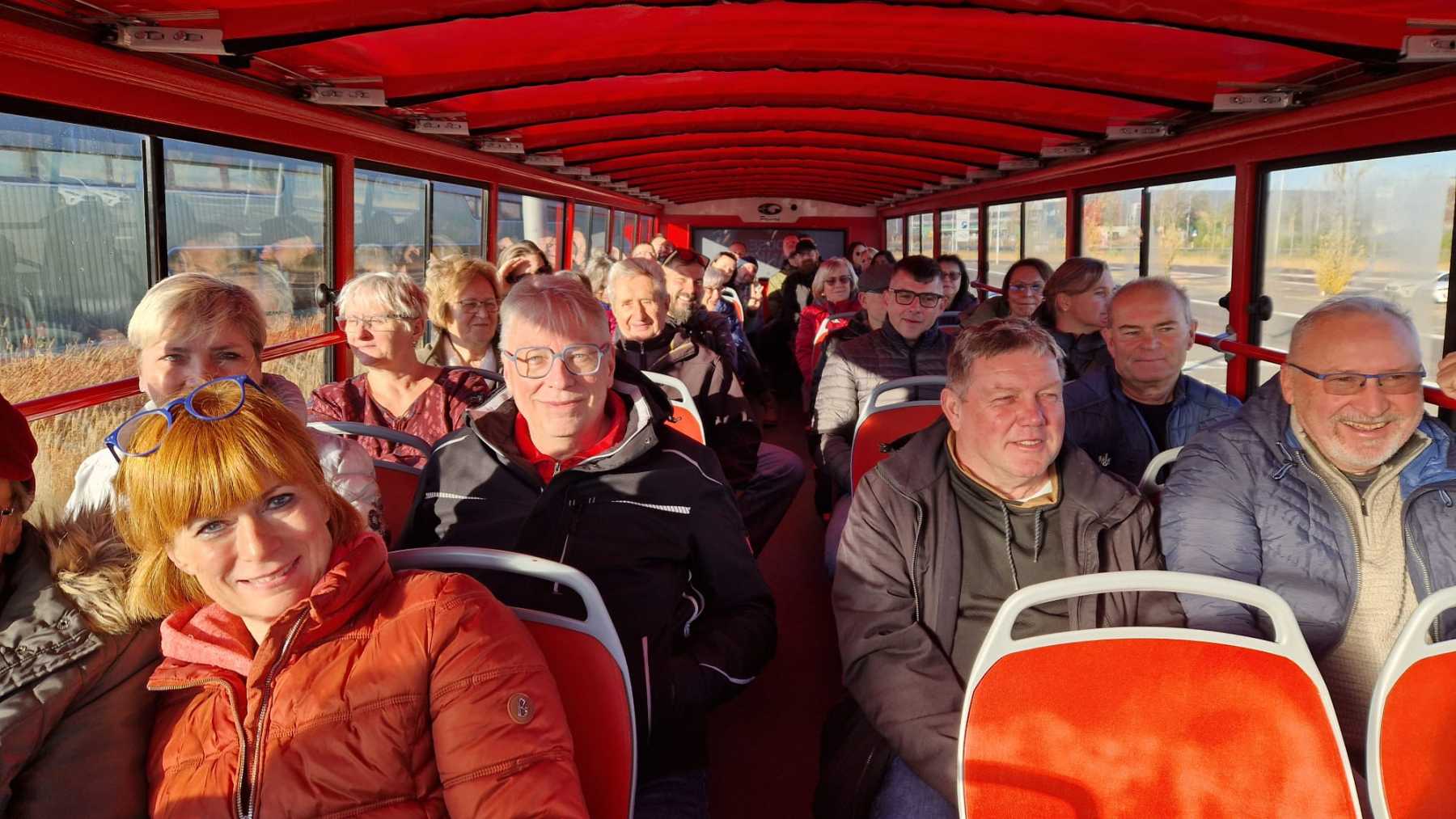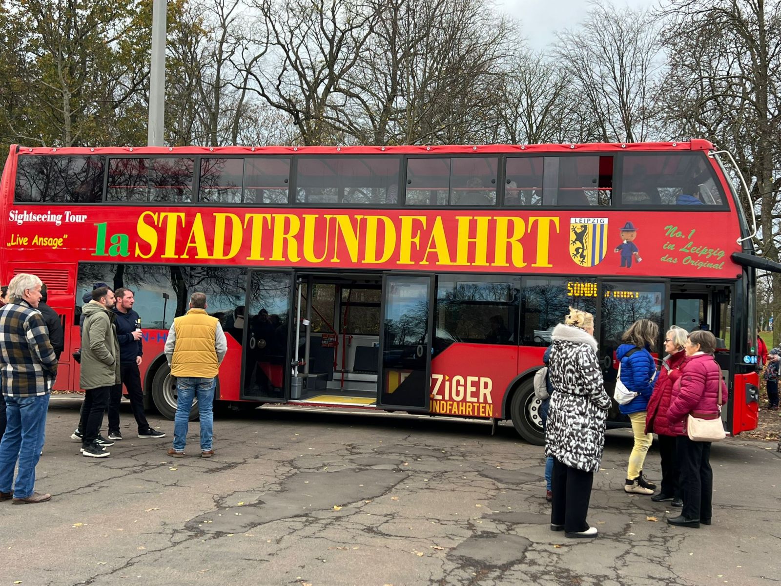 Das nächste Highlight fand zwei Tage später, also am Buß- und Bettag statt. Im Nachgang zu unserem 65. Vereinsjubiläum fuhr an diesem Tag pünktlich, um 9.45 Uhr, ein Roter Doppeldeckerbus der Leipziger Stadtrundfahrten am Vereinsgelände vor. Dort durften alle einsteigen, die vom Verein geehrt wurden, einzelne Sponsoren/Unterstützer oder Mitglieder/Gäste, die bei der Tombola am 20.09.2025 eine Fahrkarte zur Stadtrundfahrt gewonnen hatten. Begleitet wurden sie vom Vorstand des SGS mit „Anhang“. Dank des kompetenten Busfahrers und der sehr lustigen Stadtführerin Leonie, wurden die drei Stunden für alle Mitfahrer zu einem tollen, unvergessenen Erlebnis.