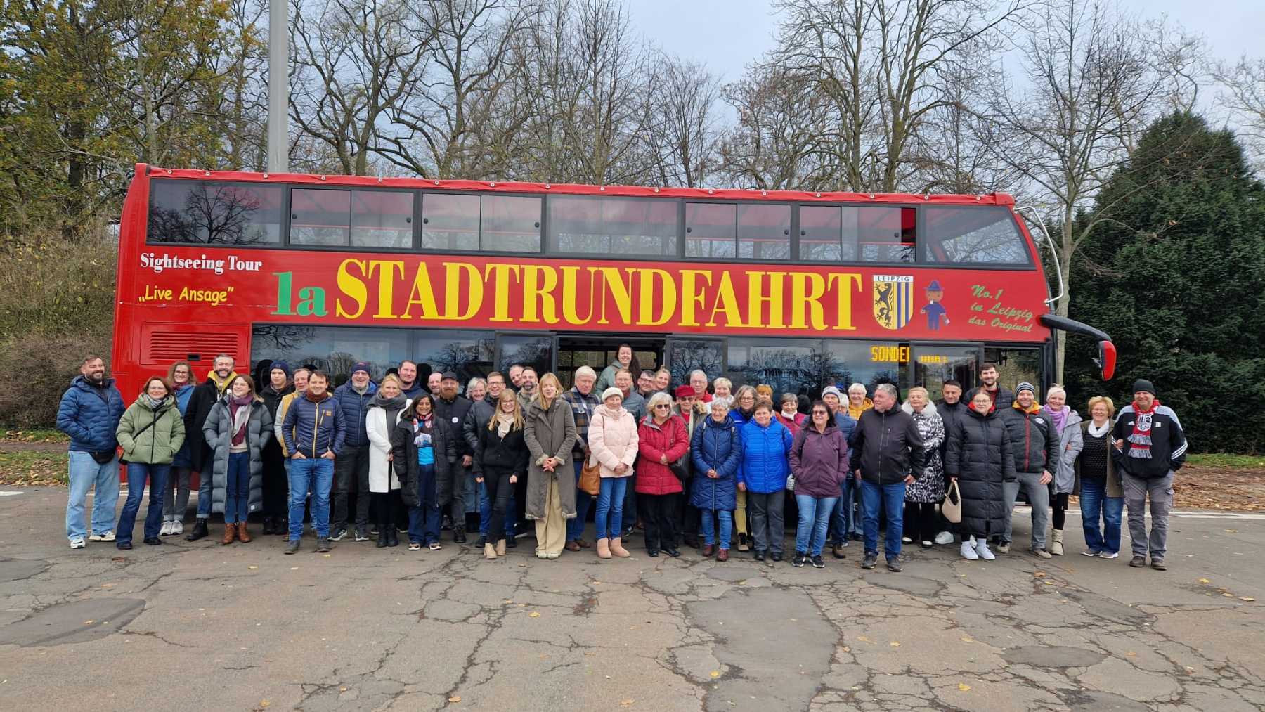 Das nächste Highlight fand zwei Tage später, also am Buß- und Bettag statt. Im Nachgang zu unserem 65. Vereinsjubiläum fuhr an diesem Tag pünktlich, um 9.45 Uhr, ein Roter Doppeldeckerbus der Leipziger Stadtrundfahrten am Vereinsgelände vor. Dort durften alle einsteigen, die vom Verein geehrt wurden, einzelne Sponsoren/Unterstützer oder Mitglieder/Gäste, die bei der Tombola am 20.09.2025 eine Fahrkarte zur Stadtrundfahrt gewonnen hatten. Begleitet wurden sie vom Vorstand des SGS mit „Anhang“. Dank des kompetenten Busfahrers und der sehr lustigen Stadtführerin Leonie, wurden die drei Stunden für alle Mitfahrer zu einem tollen, unvergessenen Erlebnis.