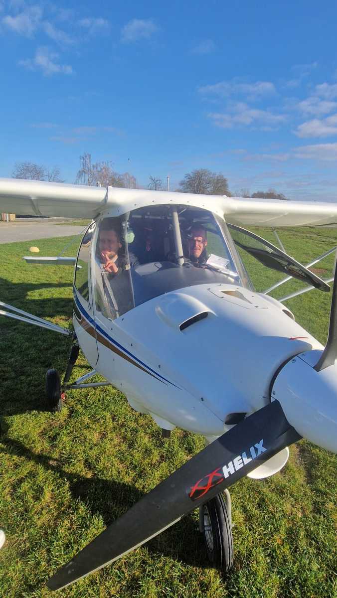 Und schließlich konnte am Samstag, 22.11.2025, auch der Hauptpreis unserer Jubiläums-Tombola eingelöst werden. Um 11 Uhr trafen sich unsere Gewinnerin Luise mit ihrem Mann Kevin und den beiden kleinen Söhnen auf dem Flugplatz Taucha. Dort wurden sie schon vom Piloten Hannes und einem Zwei-Sitzer-Kleinflugzeug, welches angesichts der eiskalten Temperaturen bereits aufgeheizt wurde, erwartet. Luise und Kevin hatten sich geeinigt, dass der Mann in die Lüfte gehen darf. So hob die Maschine nach dem ganzen erforderlichen Vorgeplänkel um 11.45 vom Boden ab und zog eine große Runde über Leipzig und Umgebung. Und da die Herren bereits um 13.20 Uhr wieder zurück waren, konnte auch Luise für ca. 10 min in die Lüfte steigen und den Blick von oben genießen. Beiden hat es sehr gefallen, war eine großartige Erfahrung und wird noch lange in Erinnerung bleiben. Herzlichen Dank an Hannes und den Flugplatz Taucha!